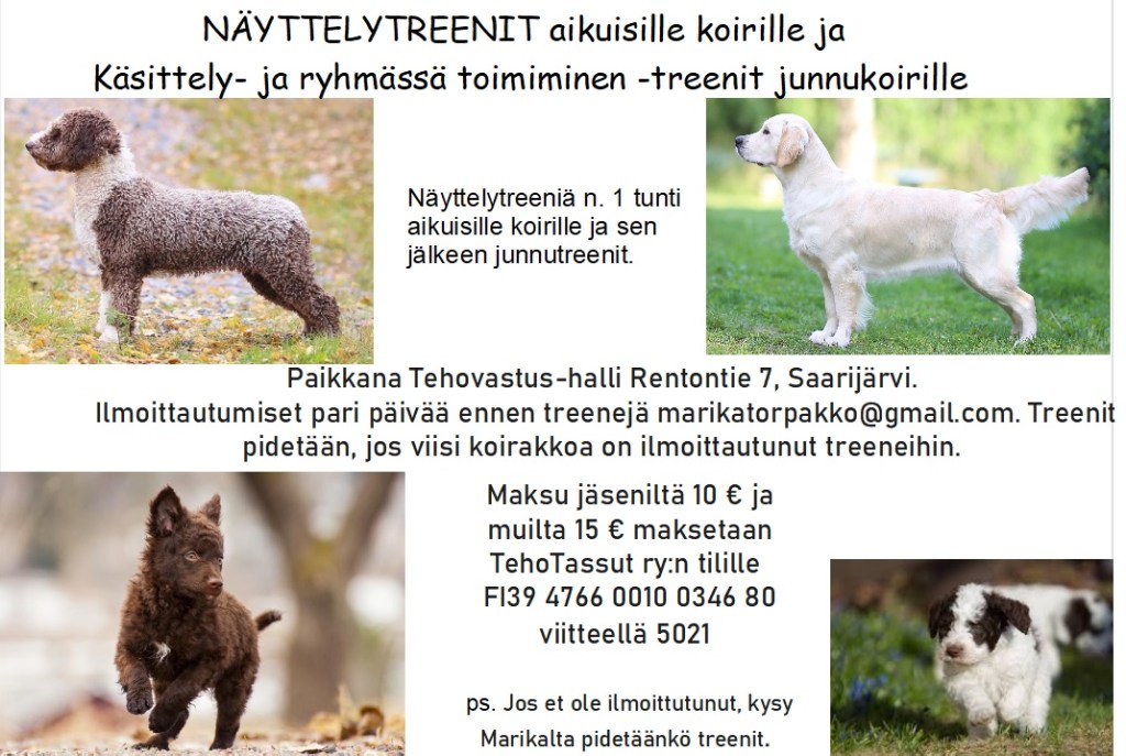 Ajankohtaista Näyttely- ja käsittelytreenit pidetään noin kerran kuukaudessa. Niistä ilmoitetaan TehoTassujen fbk-sivulla. Jaa tämä: Jaa X:ssä(Avautuu uudessa ikkunassa) X Jaa Facebookissa(Avautuu uudessa ikkunassa) Facebook Tykkää Lataa...